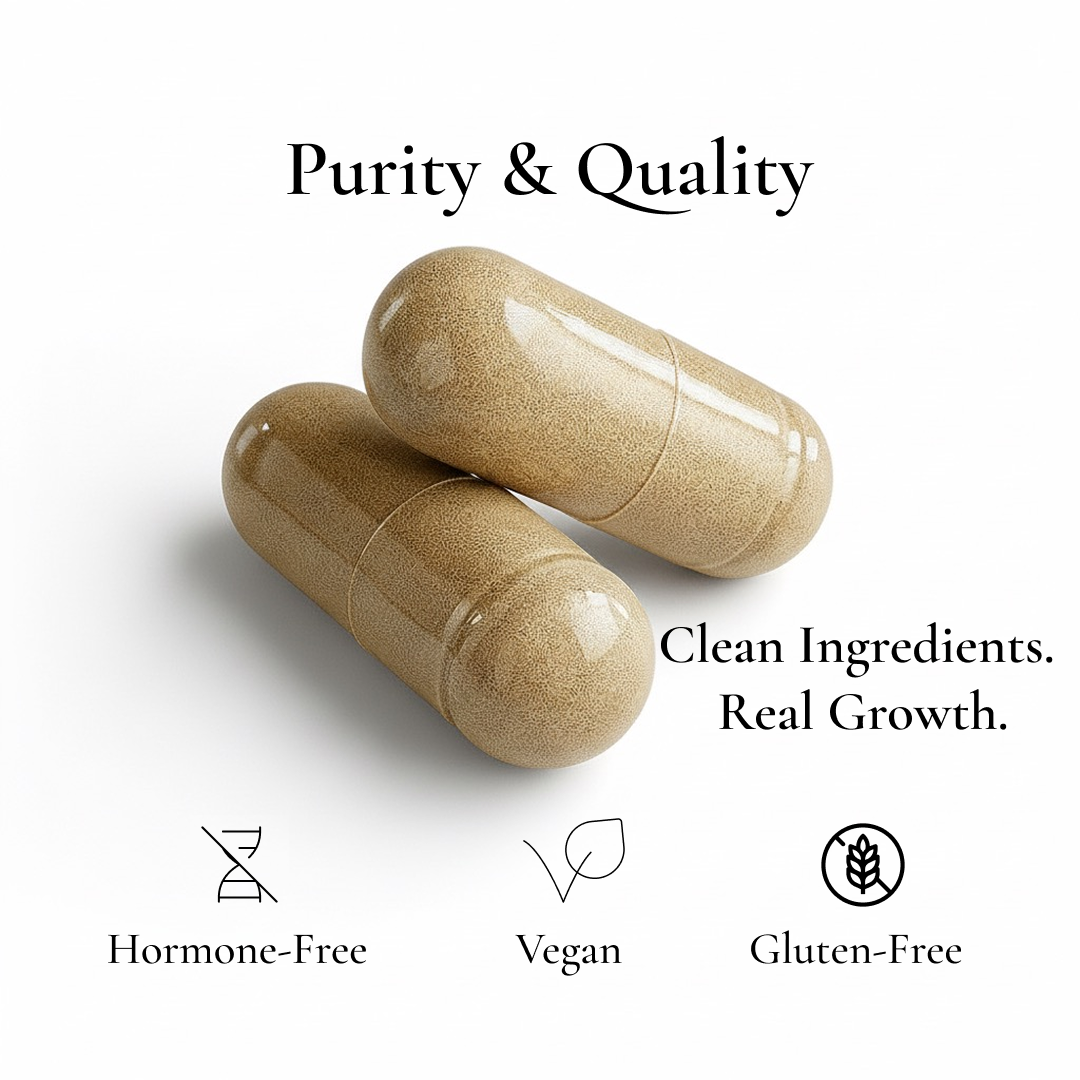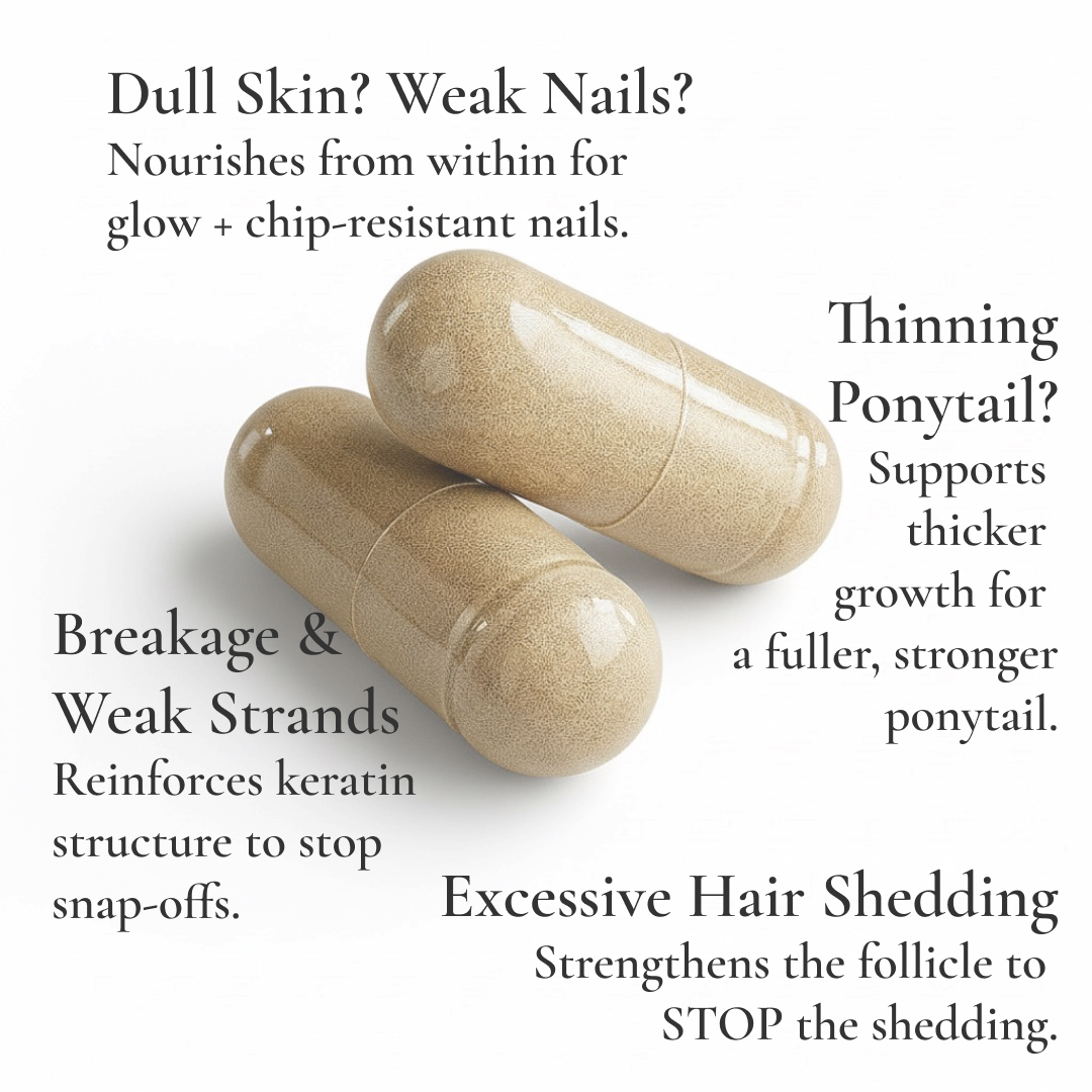 Powered by a high-potency dose of Biotin (Vitamin B7) and fortified with Folate (Vitamin B9), our formula provides the essential building blocks for keratin production. It works at the follicular level to support the natural hair growth cycle, encourage thickness, and restore vitality to every strand.